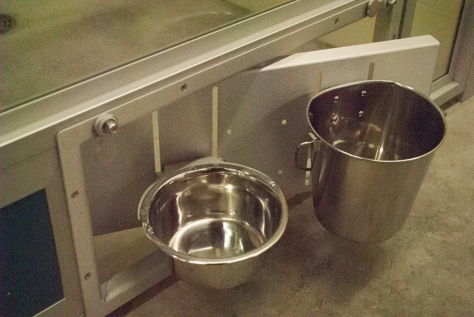 Our swivel feeders easily twist out from the front of the door so we can change food and water without disturbing your pet. (See picture).